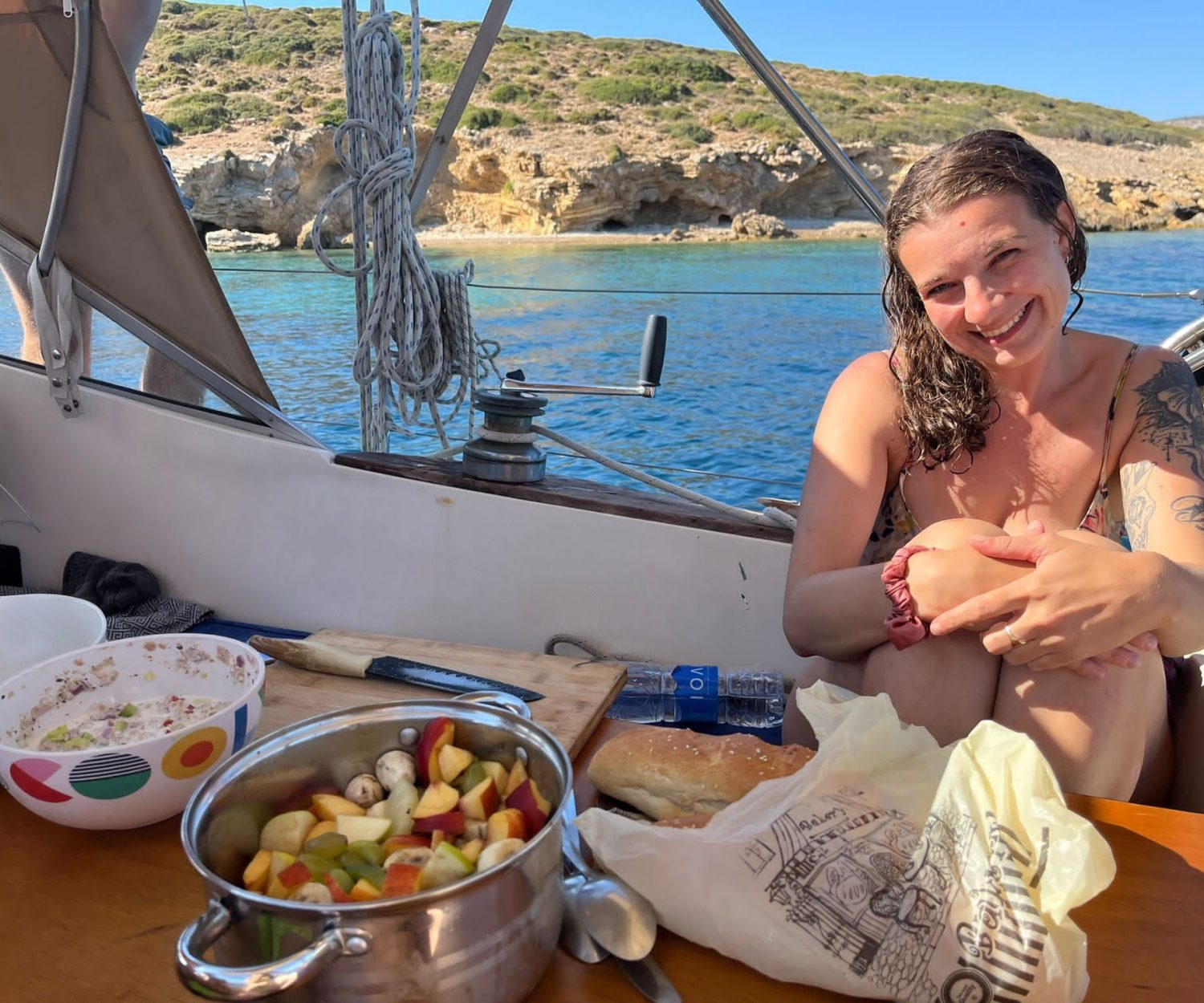 Group lunch on the boat. Delicious Greek Mezze. If we catch - fresh fish! Glas of graci lefko can't hurt.